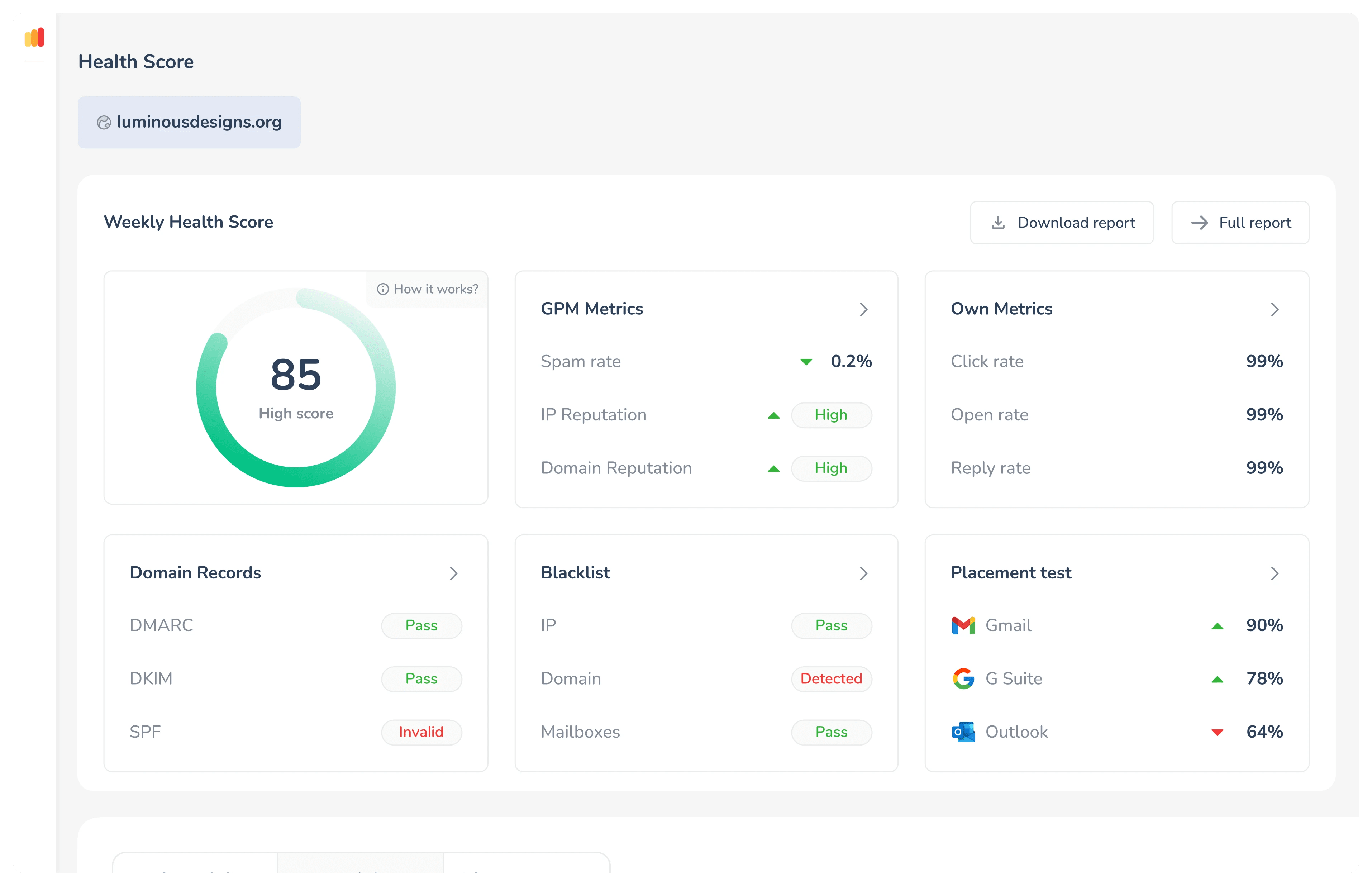 • Essential tool for monitoring Gmail deliverability performance.