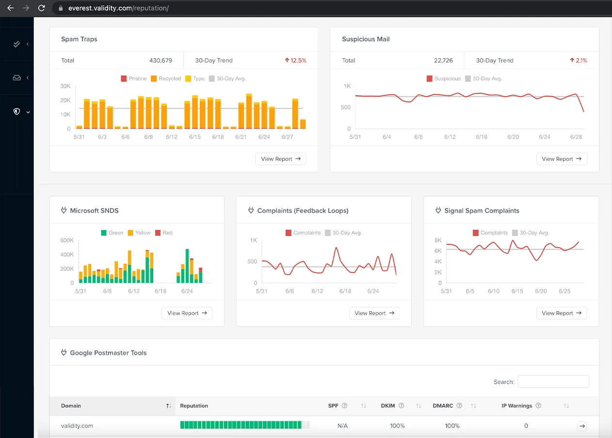 This tool is primarily designed for high-volume senders and gives users direct insight into how Gmail views their sending domain and IP addresses. This data helps teams detect vulnerabilities early on in the program and adjust their sending practices before campaigns begin landing in spam.