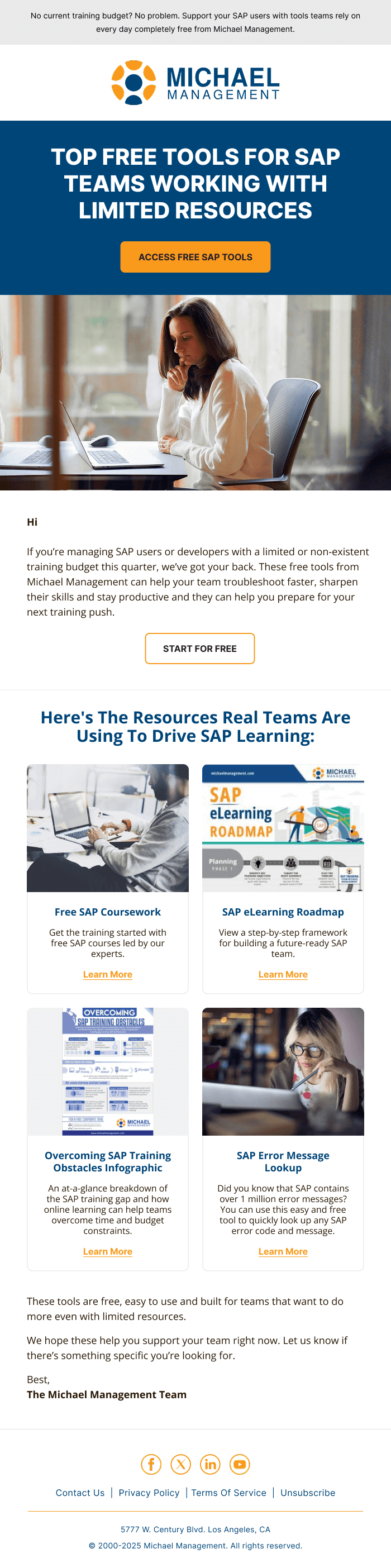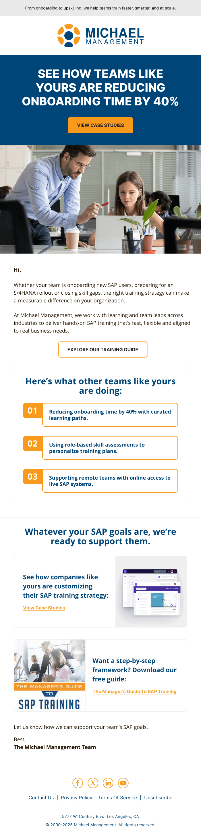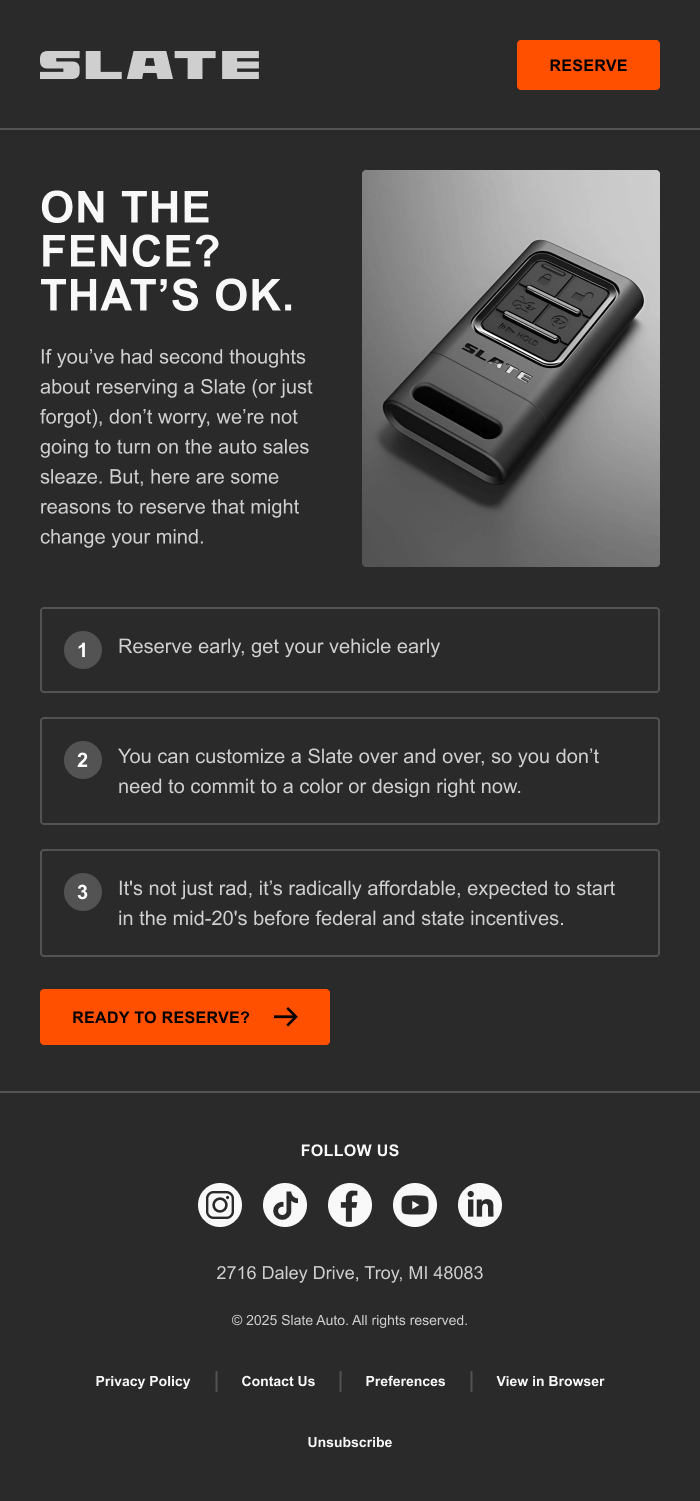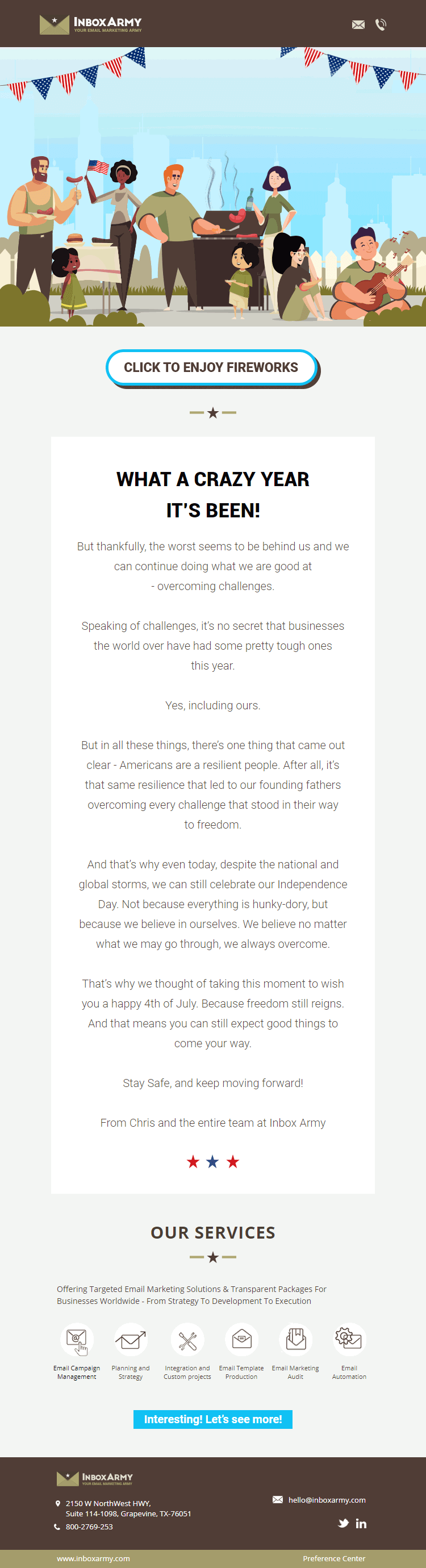 We hired InboxArmy to redesign Salesforce Marketing Cloud emails. The goal was to create a new master template that matched branding using industry best practices. After we signed the SOW, we had a couple discovery calls, submitted our brief and branding document. Once we were on the same page, InboxArmy did design in batches, we had 3 rounds of reviews and once all was finalized IA coded and implemented the templates for us in MC.